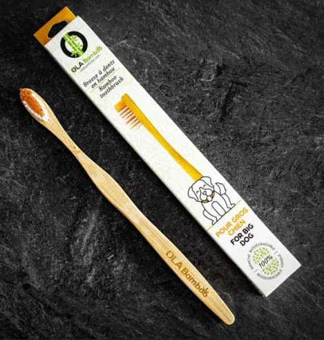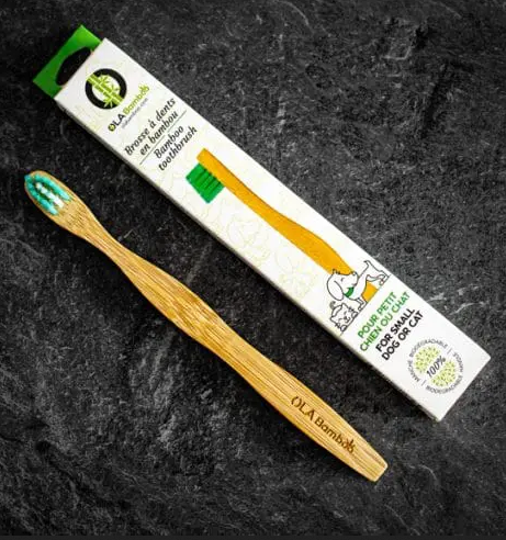 Curved head specially designed to better reach all teeth in the animal's oral cavity Compact head for effective, more pleasant brushing Two formats available: Small Dog or Cat and Large Dog The handle of the toothbrush is 100% compostable and biodegradable. It is made of bamboo. The bristles of the OLA Bamboo toothbrush are made of high-quality nylon for better brushing. According to some studies, bamboo has natural antimicrobial properties. Made from FSC certified bamboo to ensure best practices in managing responsible forests Designed in Canada and made in China The packaging is also recyclable or compostable by your city. Bamboo cultivation is done without using pesticides or insecticides Bamboo forests absorb 35% more CO2 than a regular mixed forest
