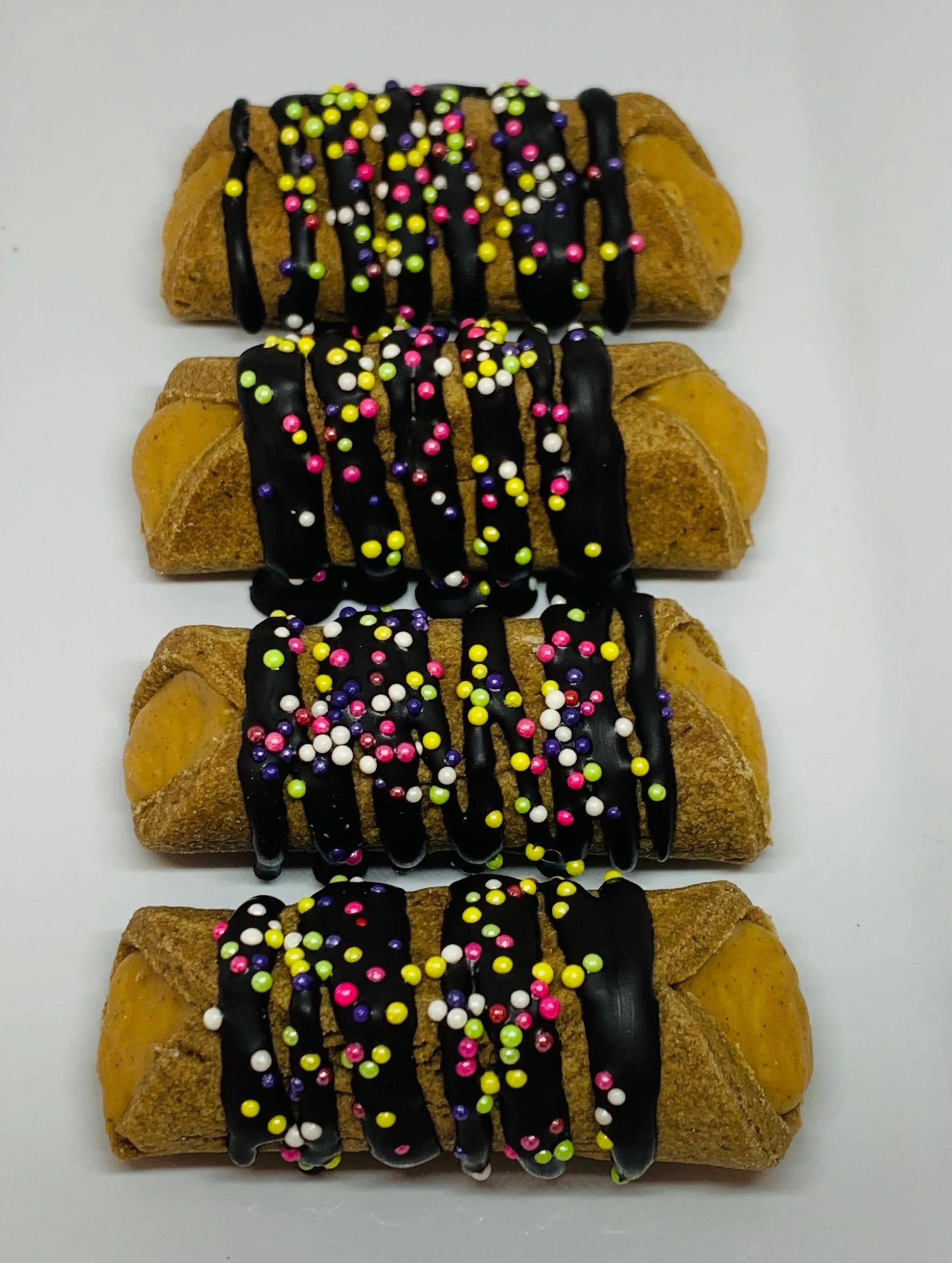 Just like a human cannoli, but made for dogs. Tubular carob shell of sweet yumminess filled with peanut butter and drizzled with carob icing and sprinkles. Medium size cookie. Sprinkles color subject to change with season/holidays.