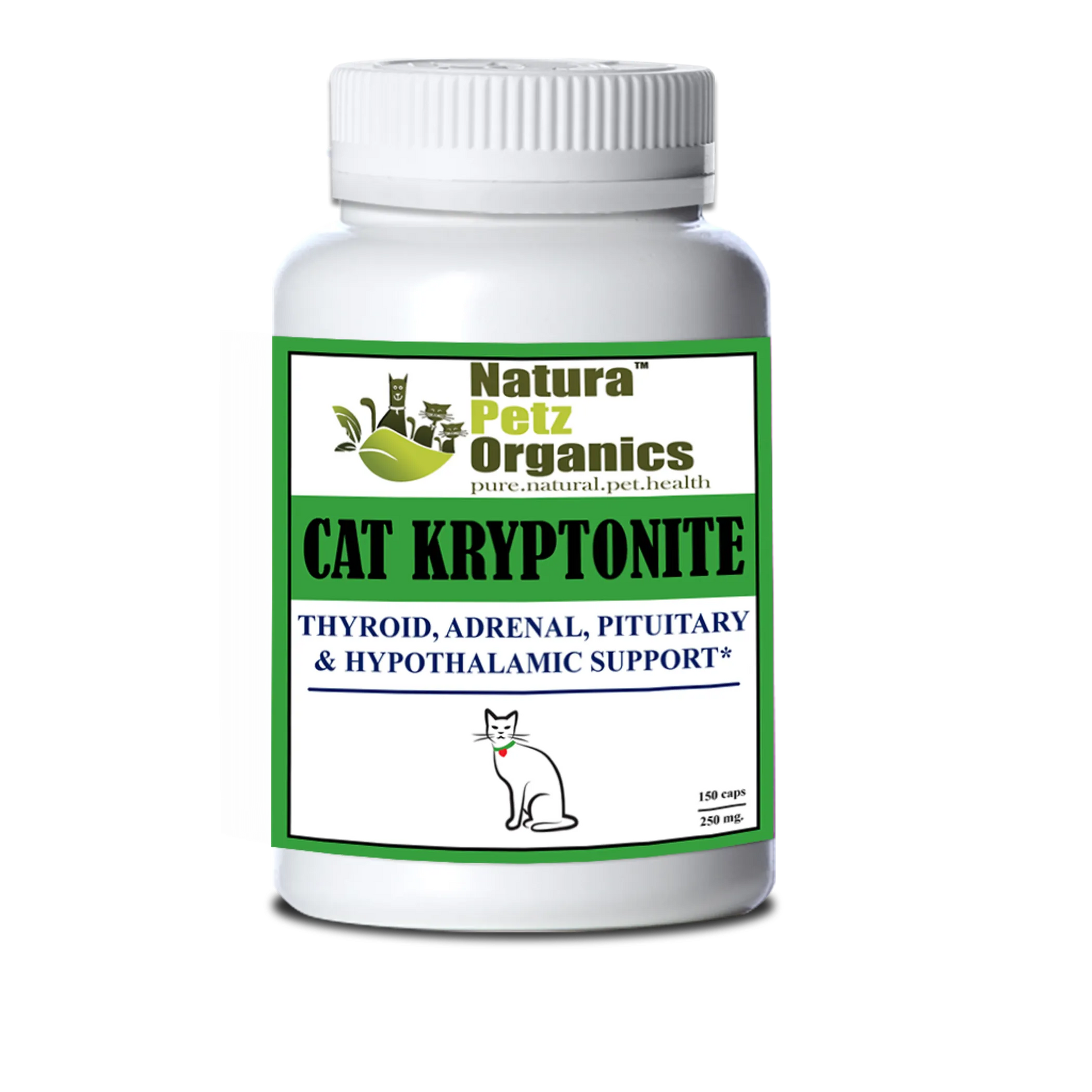 DOG AND CAT KRYPTONITEis used holistically to help deliver vital nutrition to organs which are charged with supporting endocrine support, specifically thyroid and hypothalamic-pituitary adrenal (HPA) function; to help nutritionally balance adrenal function when imbalance is present due to its adaptogenic plant actions; may help nutritionally nourish and help regenerate stressed or under performing glandular function; may help restore proper metabolic function, which is essential to all body systems and may help limit diseases caused by metabolic dysfunction such as obesity, diabetes, cardiovascular, Cushing's and Addison's disease due to its high antioxidant, free radical fighting, nutritional and adaptogen plant actions and plant profile.