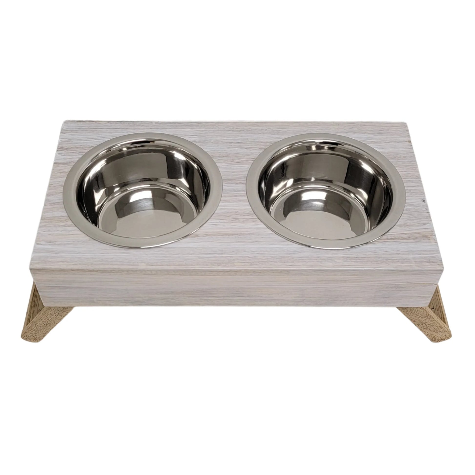 This classic, stylish and eco-friendly pet feeder is made from high-quality solid mango wood. The polished finish of the wood brings out the natural beauty of the wood grain. The dog feeder boasts two stainless steel bowls (Small = 12 fluid oz each / Medium = 24 fluid oz each) that are dishwasher safe and easy to clean. The open design of this elevated pet feeder allows your pets access the food or water at their desired level while preventing messes on your floor. The legs of the feeder are fold-able which makes it easy to store/stack the feeder when not in use.