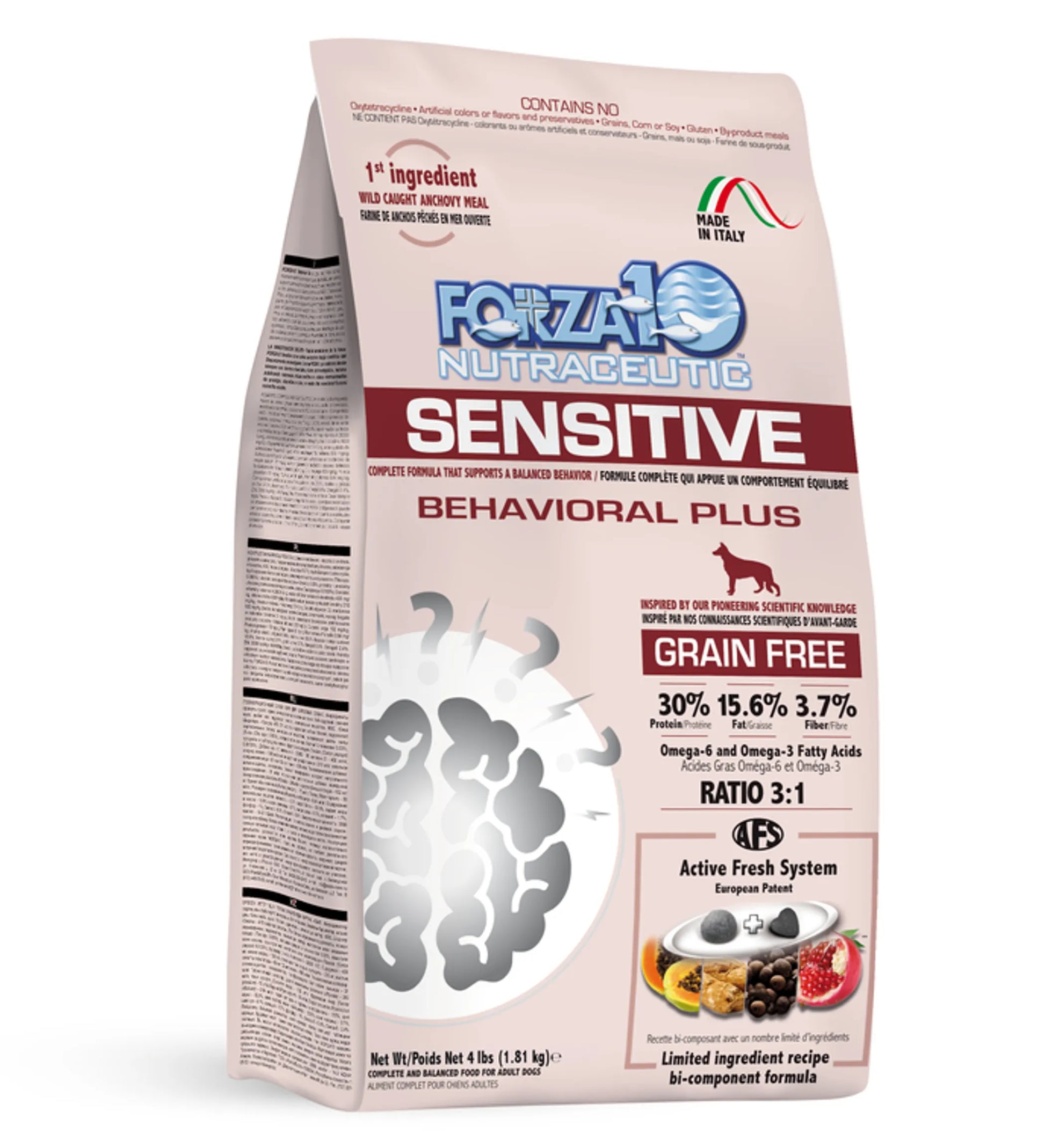 Forza10 Sensitive Behavioral Plus is a complete and balanced recipe designed to help dogs with behavior issues, such as attention disorders, nervousness, separation anxiety, constant barking, or fear. This GRAIN-FREE recipe is made with delicious wild-caught anchovy rich in Omega 3, and a mix of therapeutic plants and fruit extracts, which naturally provide physical wellbeing in dogs. All selected ingredients are high quality and premium grade. Forza10's recipes are free from all the bad stuff; never any GMOs, corn, wheat, soy, by-products, oxytetracycline, artificial preservatives, colors or flavors. Feel like a great pet parent by giving this super delicious and nutritious recipe to your pup!