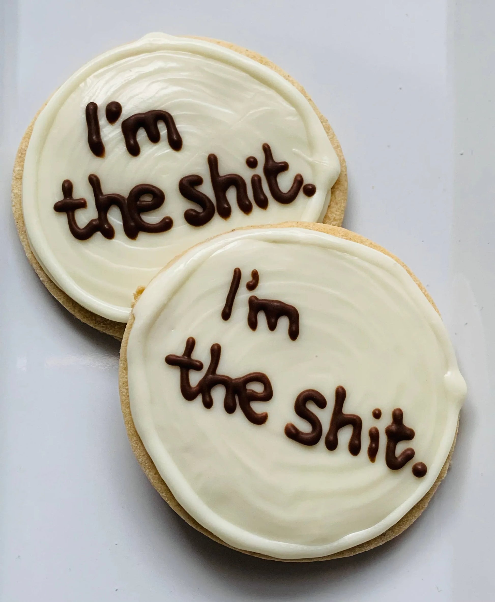 Sassy round vanilla cookie, dipped in white vanilla icing and showing some puppy attitude in carob icing.