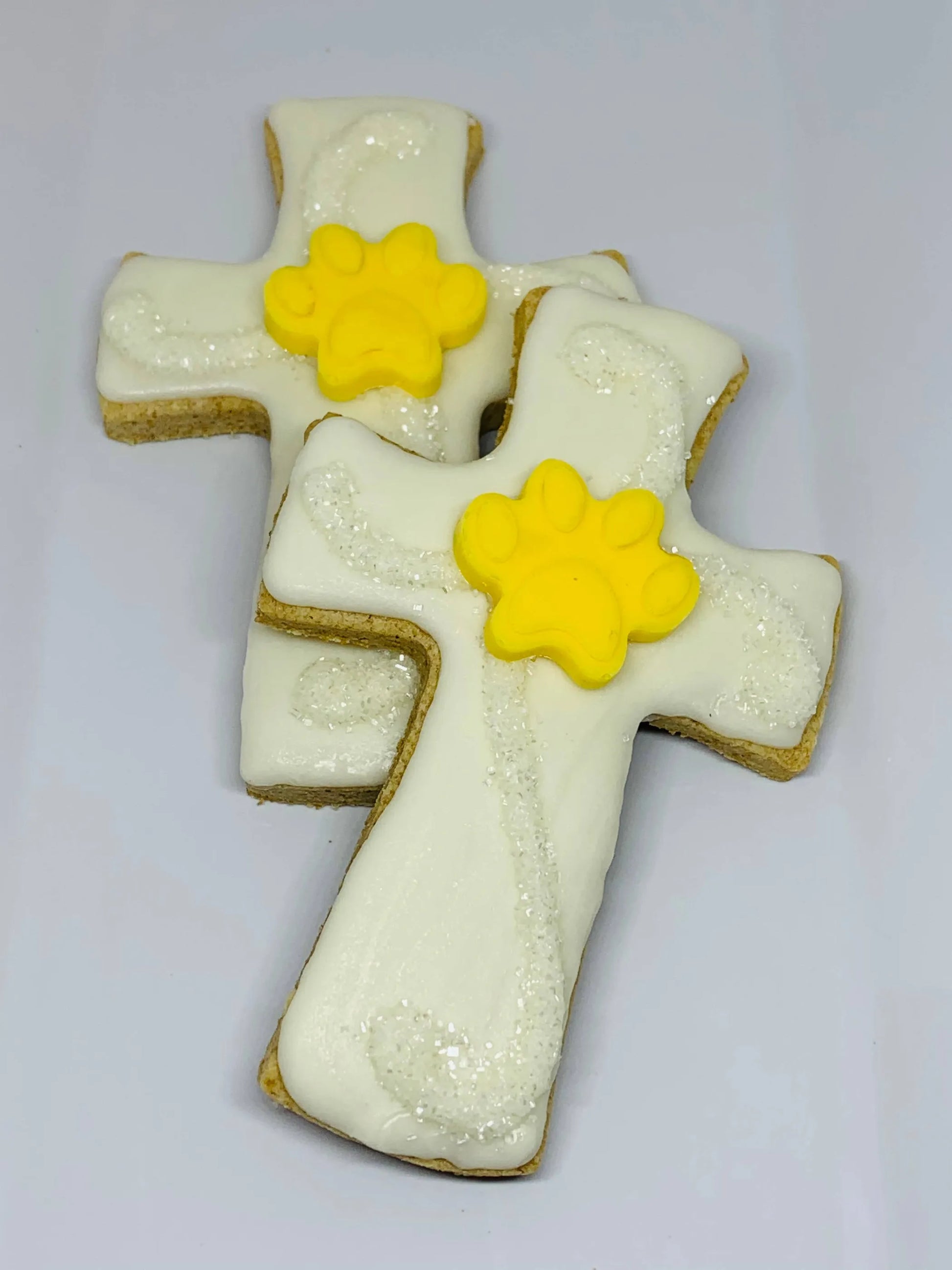 Vanilla goodness dipped in vanilla icing, trimmed with swirls of white sparkly sanding sprinkles and a yellow paw in the center.