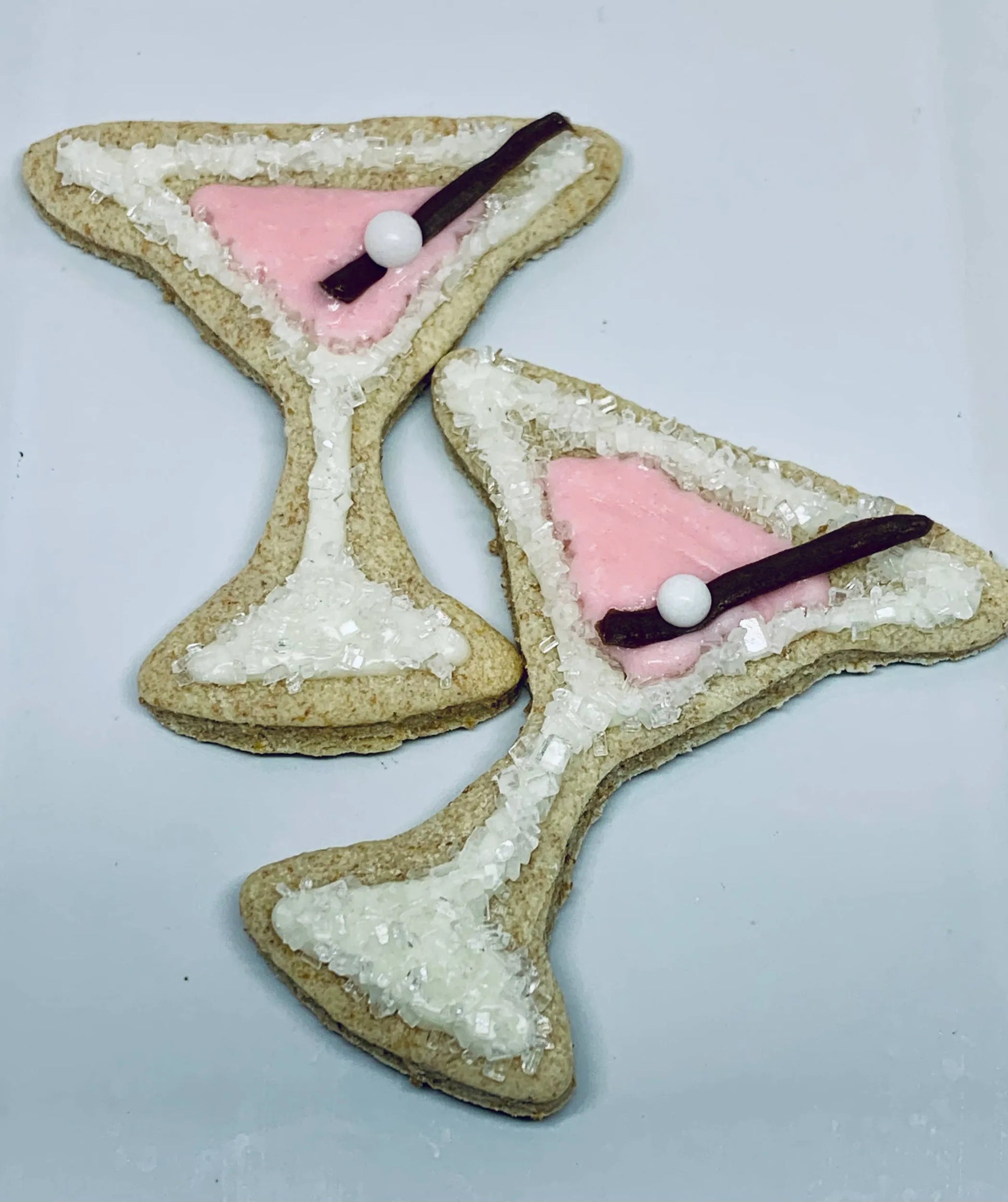 Small, cute vanilla cookie shaped as a martini glass, decorated with white and pink vanilla icing, white sparkling sugar and touched with a carob swizzle stick.