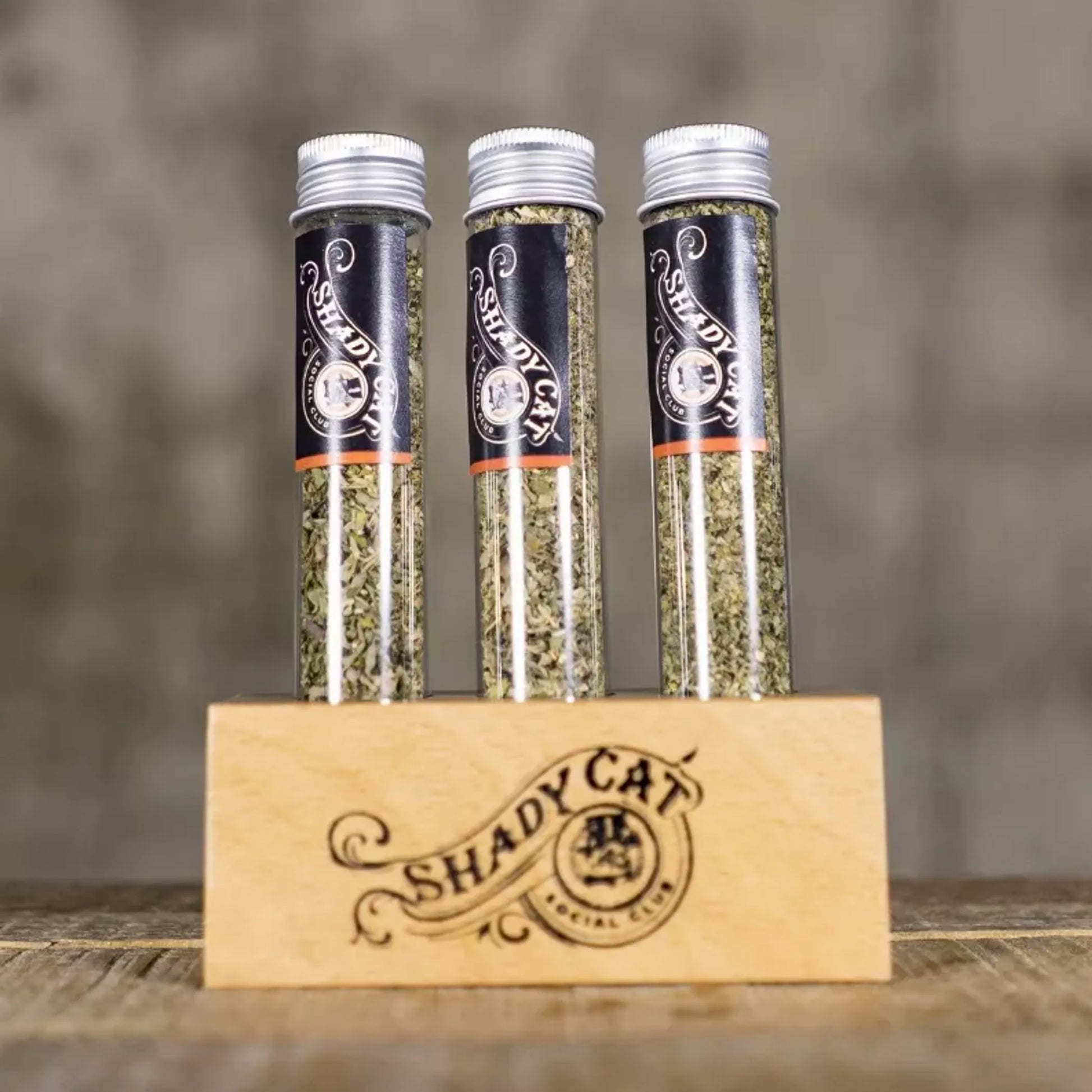 Shady Cat’s most amazing offering: Three of our favorite blends of catnip, very generous “samples" of each, served in glass tubes and silver screw top. They set in a custom wooden base and can be reused in a million different ways- the ideas are limited only by your imagination. But that’s not it! You also receive a sample tin of Silvervine. If you are looking for the perfect gift for a cat lover, you have found it! This custom crafted catnip flight was designed with two customers in mind: the Inquisitive Cat Lover who wants to try out a new offering and see what it's all about and also the Ultimate Gifter who HAS to find the most interesting and different gift for the people on their list!