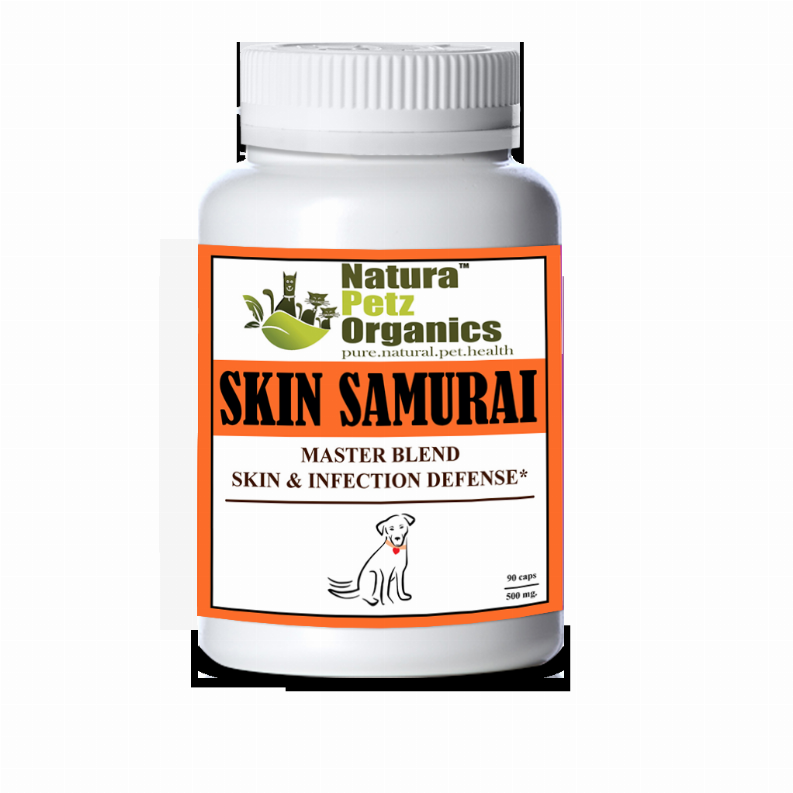 SKIN SAMURAI may be an invaluable addition to a pet's diet who suffers from idiopathic skin allergens and allergic atopic or contact dermatitis, as its plant actions moderate cellular inflammation that is triggered by excess mast and histamine response (allergen triggers) as its plant actions work to help block mast and histamine receptors.