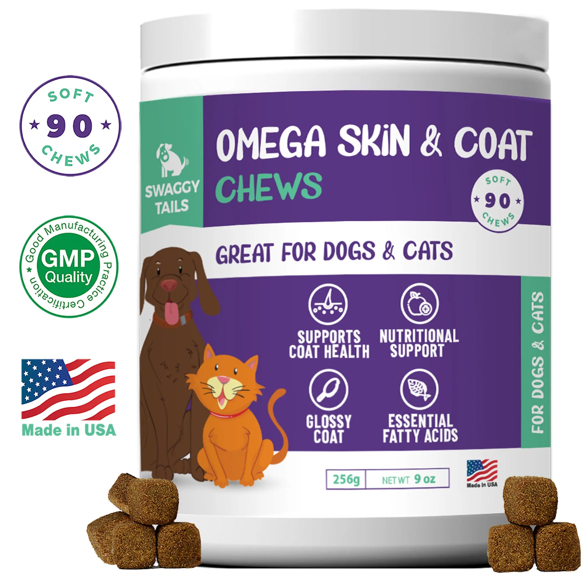 Enjoy a soft, shiny coat: Always make sure your pet has healthy skin and a soft coat with the Omega Skin & Coat Chews from Swaggy Tails! These cat and dog fish oil supplements have been designed to provide the nourishment pets need to maintain shiny, strong, and soft fur, in addition to ensuring skin is always moisturized. 90 Soft Chews.